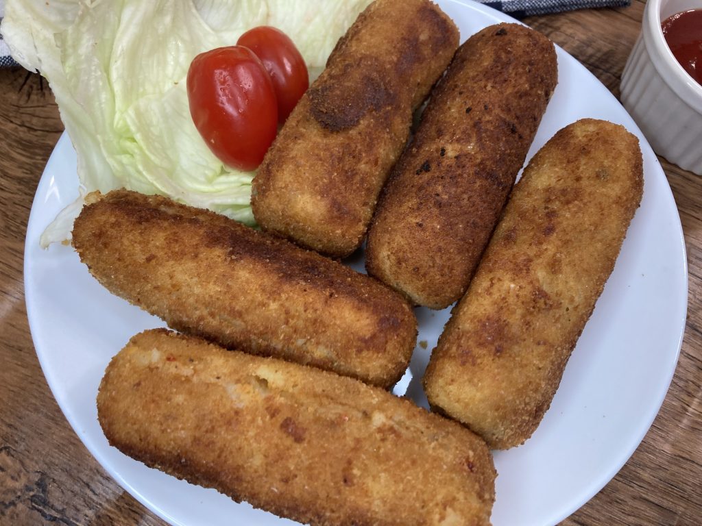 Take a small portion of the potato mixture and flatten it in your hand. Place a mozzarella cheese stick in the center and gently roll the potato mixture around it, forming a smooth roll. - Coat the Rolls: